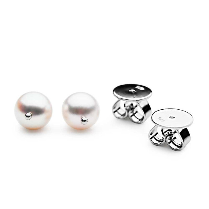 We, Pacific Pearls International use Akoya Pearl which is a saltwater cultured pearls from the Akoya oyster used for necklaces, pendants, rings, bracelets and other pearl jewellery items. Akoya pearls are preferred by most retailers and buyers as the complete pearl choice for its perfect round shapes, bright mirror-like lustre and neutral colours. Our classic AAA quality 7.5-8 mm Japanese White Akoya Pearl Stud Earrings comes with an 18k (750) White Gold Points design and are securely hand-mounted in silver with Extra Large Heavy 9mm Earrings Backs. Either be a pearl necklace, pearl pendant, pearl bracelet, or even one of your pearl rings, our stunning pearl earrings will endorse it splendidly.