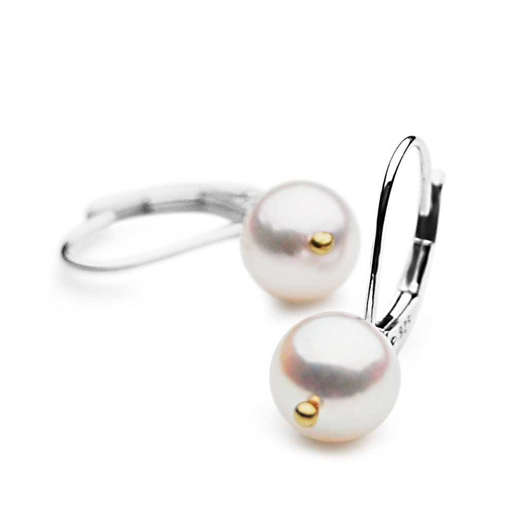 Perfect Round 7.5-8 mm AAA Quality White Japanese Akoya Saltwater Cultured Pearl Earrings Hoops Set in Silver And 18k (750) Yellow Gold Points .