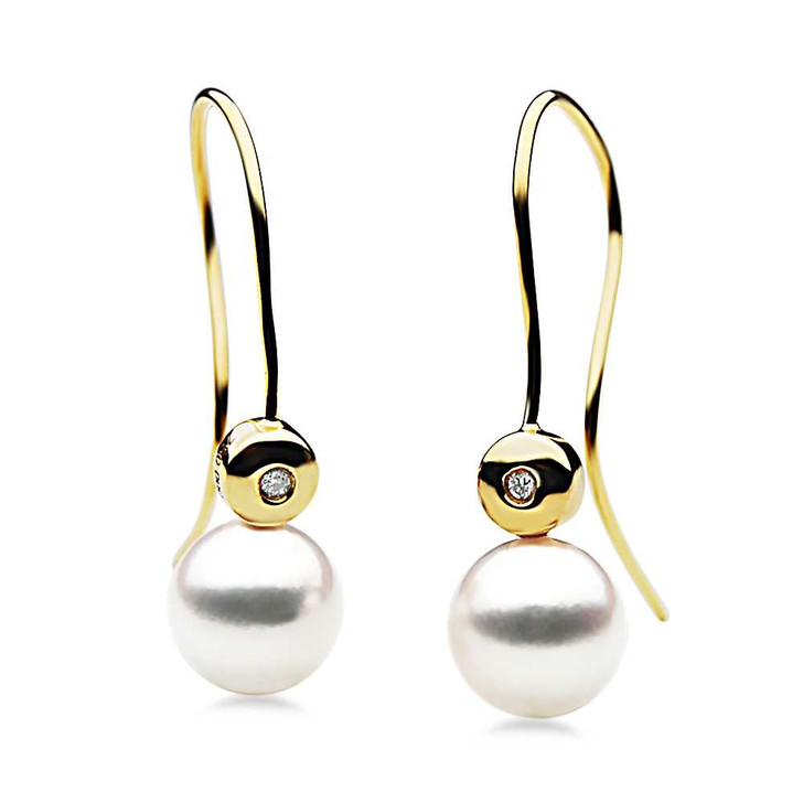 Perfect Round 7.5-8 mm AAA Quality White Japanese Akoya Saltwater Cultured Pearl Earrings Heavy Long Hooks Set in 18k (750) Yellow Gold With 0.07ct Brilliant Diamonds .