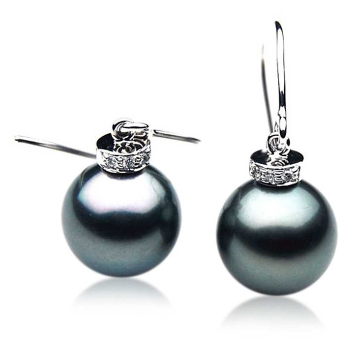 • TE069 (AAA 12mm Tahitian Black Pearl Diamond Earrings 18k White Gold ) Pearl Earrings Pacific Pearls