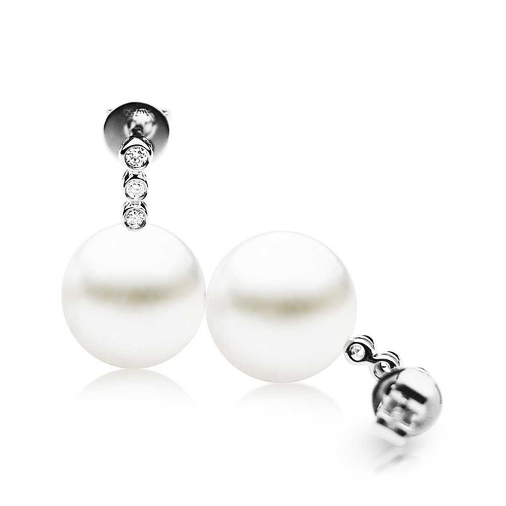 Perfect Round 10.5-11 mm AAA Quality White Freshwater Cultured Pearl Earrings set in 18k (750) White Gold with 0.07 CT Brilliant Diamonds