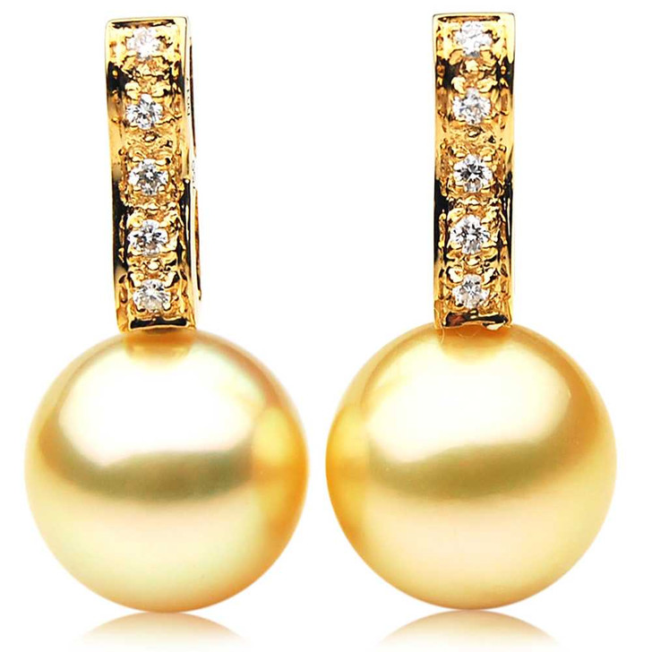 Perfect Round 12.8-13 mm AAA Quality Australian Golden South Sea Pearl Earrings set in 18k (750) Yellow Gold with 0.08 CT Brilliant Diamonds