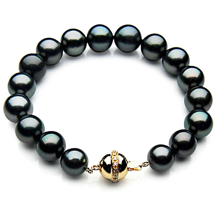 Perfect Round 9-11mm AAA Quality Tahitian Black Pearl Bracelet with 18k (750) Yellow Gold Diamond Clasp set in 0.10ct Diamonds, 18cm (7 inches) Long