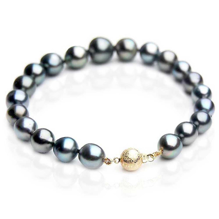 We, Pacific Pearl International are being proud of crafting high-class pearl jewellery items to satisfy all our customer needs. You can explore a thousand of pearl jewellery accessories like a pearl necklace, pearl bracelet, pearl pendant or pearl ring at one's doorstep! Natural black colour Tahitian pearls are among the most popular cultured pearls in the marketplace today. Harvested in the cold water, these precious gemstones come to us from the black-lip oyster - Pinctada margaritifera. Available in a wide range of natural colours, from cool white to deep black, these treasured pearls are often referred to as Tahitian black pearls because they may feature deep, dark black overtones, lustre and smoothness. Hand-selected for perfect round shape, mirror-like lustre and unique beauty, this classic AA quality 9mm-11mm Tahitian Black Pearl bracelet explores a stunning simplicity to your style that will last for years to come. Our amazing pearl bracelet can be worn on any occasion, whether formal evening event or everyday casual attire.
