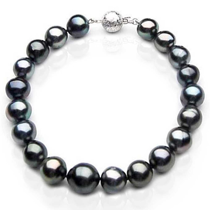 We, Pacific Pearl International are being proud of crafting high-class pearl jewellery items to satisfy all our customer needs. You can explore a thousand of pearl jewellery accessories like a pearl necklace, pearl bracelet, pearl pendant or pearl ring at one's doorstep! Natural black colour Tahitian pearls are among the most popular cultured pearls in the marketplace today. Harvested in the cold water, these precious gemstones come to us from the black-lip oyster - Pinctada margaritifera. Available in a wide range of natural colours, from cool white to deep black, these treasured pearls are often referred to as Tahitian black pearls because they may feature deep, dark black overtones, lustre and smoothness. Hand-selected for perfect round shape, mirror-like lustre and unique beauty, this classic AA quality 10mm-12mm Tahitian Black Pearl bracelet explores a stunning simplicity to your style that will last for years to come. Our amazing pearl bracelet can be worn on any occasion, whether formal evening event or everyday casual attire.